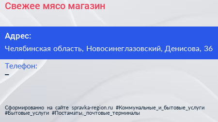 Свежее мясо, магазин по адресу Челябинская область, Новосинеглазовский, Денисова, 36 в дальнейшем Организация, размещена в следующих категориях: