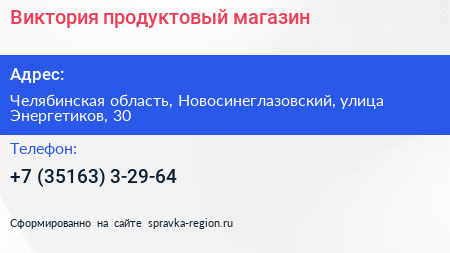 Виктория, продуктовый магазин по адресу Челябинская область, Новосинеглазовский, улица Энергетиков, 30 в дальнейшем Организация, размещена в следующих категориях: