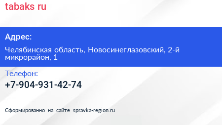 tabaks.ru по адресу Челябинская область, Новосинеглазовский, 2-й микрорайон, 1 в дальнейшем Организация, размещена в следующих категориях: