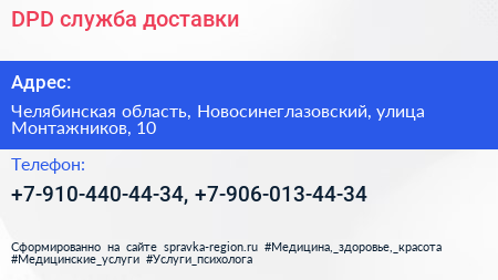 DPD, служба доставки по адресу Челябинская область, Новосинеглазовский, улица Монтажников, 10 в дальнейшем Организация, размещена в следующих категориях: