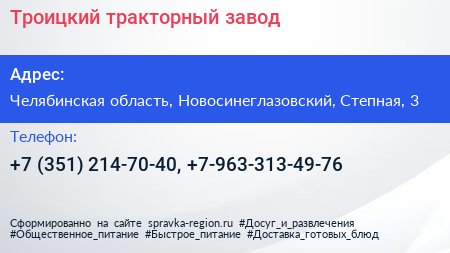 Троицкий тракторный завод по адресу Челябинская область, Новосинеглазовский, Степная, 3 в дальнейшем Организация, размещена в следующих категориях: