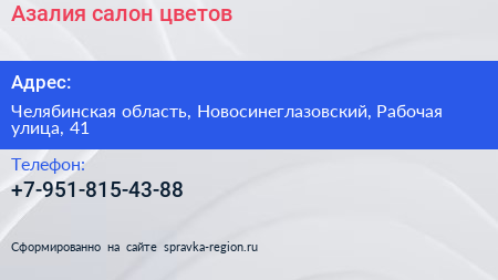 Азалия, салон цветов по адресу Челябинская область, Новосинеглазовский, Рабочая улица, 41 в дальнейшем Организация, размещена в следующих категориях: