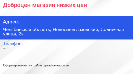 Доброцен, магазин низких цен по адресу Челябинская область, Новосинеглазовский, Солнечная улица, 2а в дальнейшем Организация, размещена в следующих категориях: