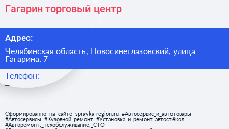Гагарин, торговый центр по адресу Челябинская область, Новосинеглазовский, улица Гагарина, 7 в дальнейшем Организация, размещена в следующих категориях: