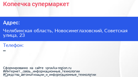 Копеечка, супермаркет по адресу Челябинская область, Новосинеглазовский, Советская улица, 23 в дальнейшем Организация, размещена в следующих категориях: