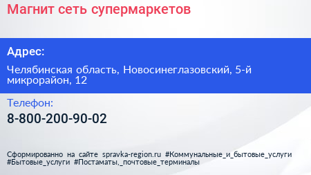 Магнит, сеть супермаркетов по адресу Челябинская область, Новосинеглазовский, 5-й микрорайон, 12 в дальнейшем Организация, размещена в следующих категориях: