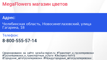 MegaFlowers, магазин цветов по адресу Челябинская область, Новосинеглазовский, улица Гагарина, 18 в дальнейшем Организация, размещена в следующих категориях: