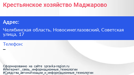 Крестьянское хозяйство Маджарово по адресу Челябинская область, Новосинеглазовский, Советская улица, 17 в дальнейшем Организация, размещена в следующих категориях:
