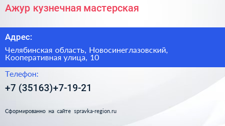 Ажур, кузнечная мастерская по адресу Челябинская область, Новосинеглазовский, Кооперативная улица, 10 в дальнейшем Организация, размещена в следующих категориях: