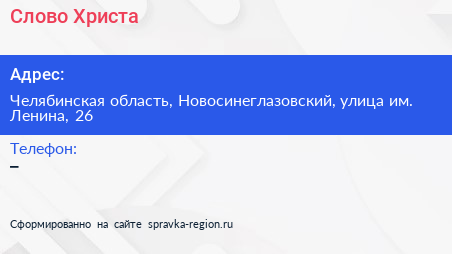 Слово Христа по адресу Челябинская область, Новосинеглазовский, улица им. Ленина, 26 в дальнейшем Организация, размещена в следующих категориях: