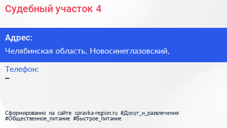 Судебный участок №4 по адресу Челябинская область, Новосинеглазовский, в дальнейшем Организация, размещена в следующих категориях: