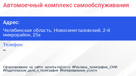 Автомоечный комплекс самообслуживания по адресу Челябинская область, Новосинеглазовский, 2-й микрорайон, 25а в дальнейшем Организация, размещена в следующих категориях: