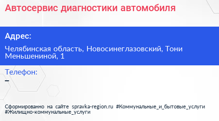 Автосервис диагностики автомобиля по адресу Челябинская область, Новосинеглазовский, Тони Меньшениной, 1 в дальнейшем Организация, размещена в следующих категориях: