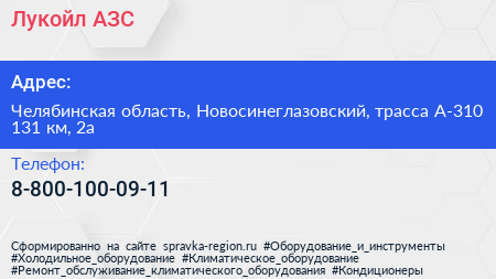 Лукойл, АЗС по адресу Челябинская область, Новосинеглазовский, трасса А-310 131 км, 2а в дальнейшем Организация, размещена в следующих категориях: