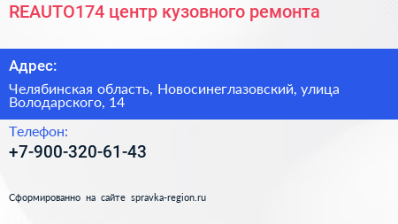 REAUTO174, центр кузовного ремонта по адресу Челябинская область, Новосинеглазовский, улица Володарского, 14 в дальнейшем Организация, размещена в следующих категориях: