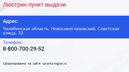 Люстрин, пункт выдачи по адресу Челябинская область, Новосинеглазовский, Советская улица, 33 в дальнейшем Организация, размещена в следующих категориях: