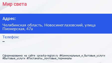 Мир света по адресу Челябинская область, Новосинеглазовский, улица Пионерская, 47а в дальнейшем Организация, размещена в следующих категориях: