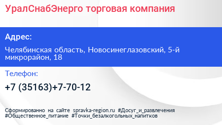 УралСнабЭнерго, торговая компания по адресу Челябинская область, Новосинеглазовский, 5-й микрорайон, 18 в дальнейшем Организация, размещена в следующих категориях: