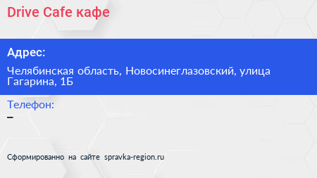 Drive Cafe, кафе по адресу Челябинская область, Новосинеглазовский, улица Гагарина, 1Б в дальнейшем Организация, размещена в следующих категориях: