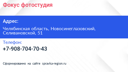 Фокус, фотостудия по адресу Челябинская область, Новосинеглазовский, Селивановской, 51 в дальнейшем Организация, размещена в следующих категориях: