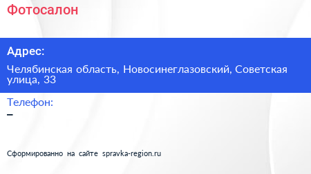 Фотосалон по адресу Челябинская область, Новосинеглазовский, Советская улица, 33 в дальнейшем Организация, размещена в следующих категориях: