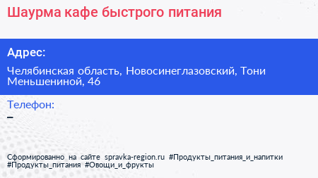 Шаурма, кафе быстрого питания по адресу Челябинская область, Новосинеглазовский, Тони Меньшениной, 46 в дальнейшем Организация, размещена в следующих категориях: