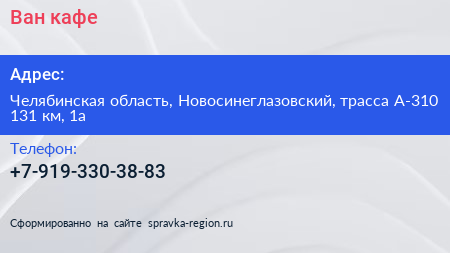Ван, кафе по адресу Челябинская область, Новосинеглазовский, трасса А-310 131 км, 1а в дальнейшем Организация, размещена в следующих категориях: