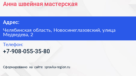 Анна, швейная мастерская по адресу Челябинская область, Новосинеглазовский, улица Медведева, 2 в дальнейшем Организация, размещена в следующих категориях: