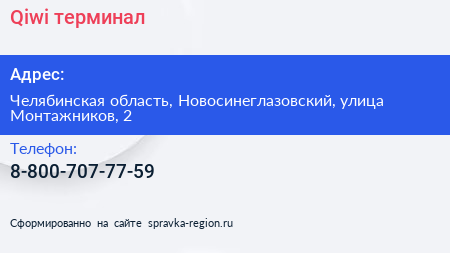Qiwi, терминал по адресу Челябинская область, Новосинеглазовский, улица Монтажников, 2 в дальнейшем Организация, размещена в следующих категориях: