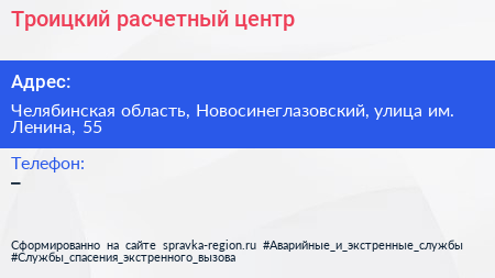 Троицкий расчетный центр по адресу Челябинская область, Новосинеглазовский, улица им. Ленина, 55 в дальнейшем Организация, размещена в следующих категориях: