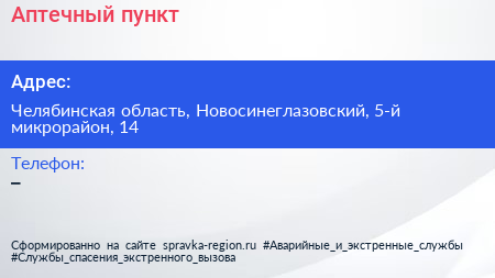 Аптечный пункт по адресу Челябинская область, Новосинеглазовский, 5-й микрорайон, 14 в дальнейшем Организация, размещена в следующих категориях: