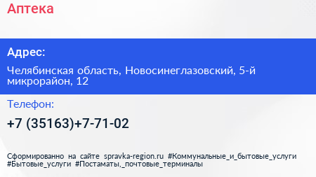 Аптека по адресу Челябинская область, Новосинеглазовский, 5-й микрорайон, 12 в дальнейшем Организация, размещена в следующих категориях: