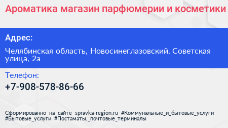 Ароматика, магазин парфюмерии и косметики по адресу Челябинская область, Новосинеглазовский, Советская улица, 2а в дальнейшем Организация, размещена в следующих категориях: