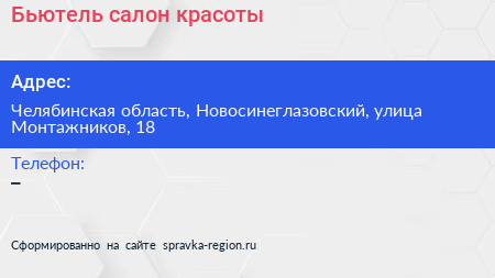 Бьютель, салон красоты по адресу Челябинская область, Новосинеглазовский, улица Монтажников, 18 в дальнейшем Организация, размещена в следующих категориях: