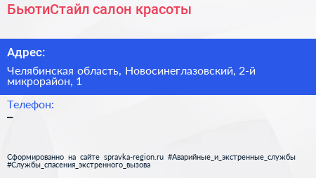 БьютиСтайл, салон красоты по адресу Челябинская область, Новосинеглазовский, 2-й микрорайон, 1 в дальнейшем Организация, размещена в следующих категориях: