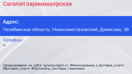 Caramel, парикмахерская по адресу Челябинская область, Новосинеглазовский, Денисова, 38 в дальнейшем Организация, размещена в следующих категориях: