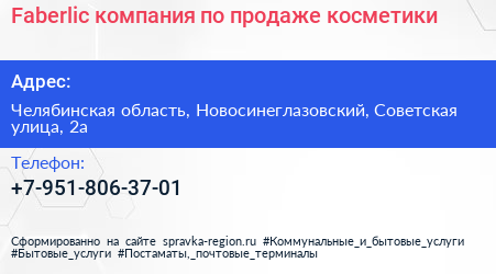 Faberlic, компания по продаже косметики по адресу Челябинская область, Новосинеглазовский, Советская улица, 2а в дальнейшем Организация, размещена в следующих категориях: