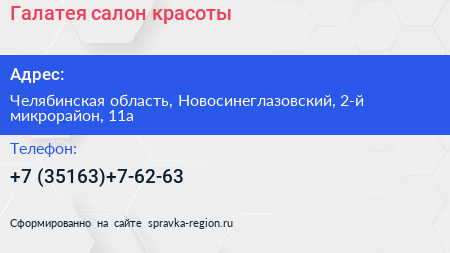 Галатея, салон красоты по адресу Челябинская область, Новосинеглазовский, 2-й микрорайон, 11а в дальнейшем Организация, размещена в следующих категориях: