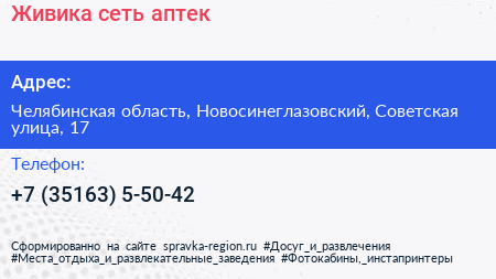 Живика, сеть аптек по адресу Челябинская область, Новосинеглазовский, Советская улица, 17 в дальнейшем Организация, размещена в следующих категориях:
