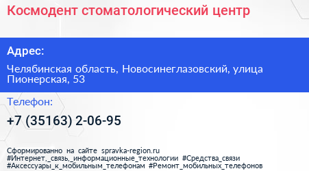 Космодент, стоматологический центр по адресу Челябинская область, Новосинеглазовский, улица Пионерская, 53 в дальнейшем Организация, размещена в следующих категориях: