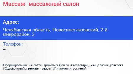 Массаж+, массажный салон по адресу Челябинская область, Новосинеглазовский, 2-й микрорайон, 3 в дальнейшем Организация, размещена в следующих категориях: