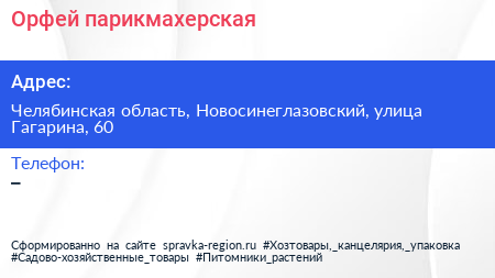 Орфей, парикмахерская по адресу Челябинская область, Новосинеглазовский, улица Гагарина, 60 в дальнейшем Организация, размещена в следующих категориях: