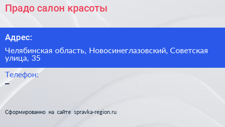 Прадо, салон красоты по адресу Челябинская область, Новосинеглазовский, Советская улица, 35 в дальнейшем Организация, размещена в следующих категориях: