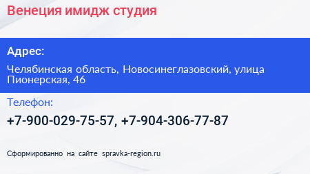 Венеция, имидж-студия по адресу Челябинская область, Новосинеглазовский, улица Пионерская, 46 в дальнейшем Организация, размещена в следующих категориях: