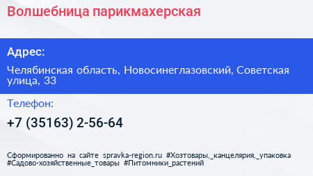Волшебница, парикмахерская по адресу Челябинская область, Новосинеглазовский, Советская улица, 33 в дальнейшем Организация, размещена в следующих категориях: