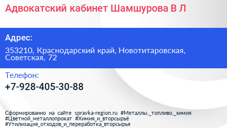 Адвокатский кабинет Шамшурова В.Л. по адресу 353210, Краснодарский край, Новотитаровская, Советская, 72 в дальнейшем Организация, размещена в следующих категориях: