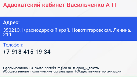 Адвокатский кабинет Васильченко А.П. по адресу 353210, Краснодарский край, Новотитаровская, Ленина, 214 в дальнейшем Организация, размещена в следующих категориях: