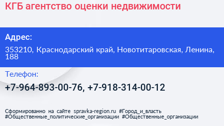 КГБ, агентство оценки недвижимости по адресу 353210, Краснодарский край, Новотитаровская, Ленина, 188 в дальнейшем Организация, размещена в следующих категориях: