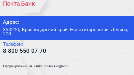 Почта Банк по адресу 353210, Краснодарский край, Новотитаровская, Ленина, 208 в дальнейшем Организация, размещена в следующих категориях: