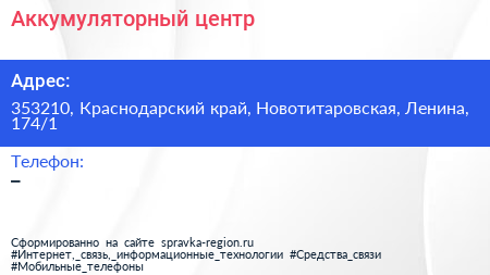 Аккумуляторный центр по адресу 353210, Краснодарский край, Новотитаровская, Ленина, 174/1 в дальнейшем Организация, размещена в следующих категориях: